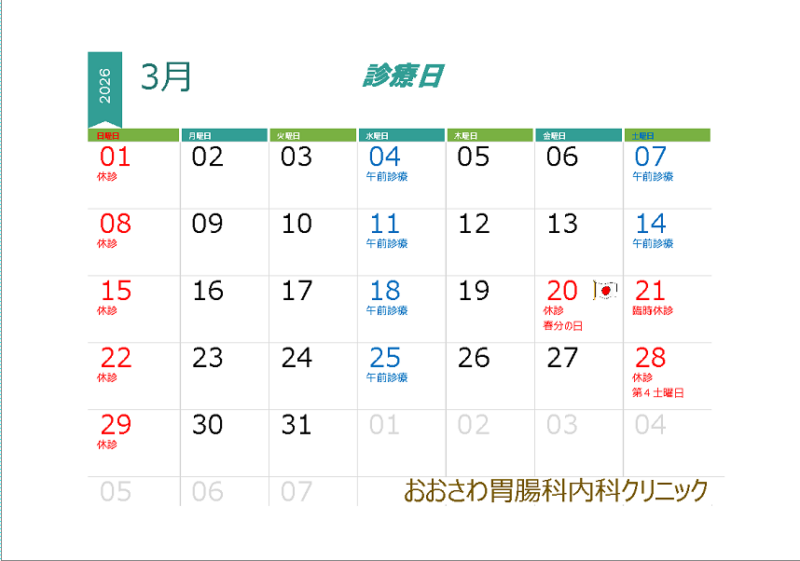 2月の診療日のお知らせ »3月14日(第2土曜日)は午前診療、3月21日(第3土曜日)は臨時休診とさせていただきます。